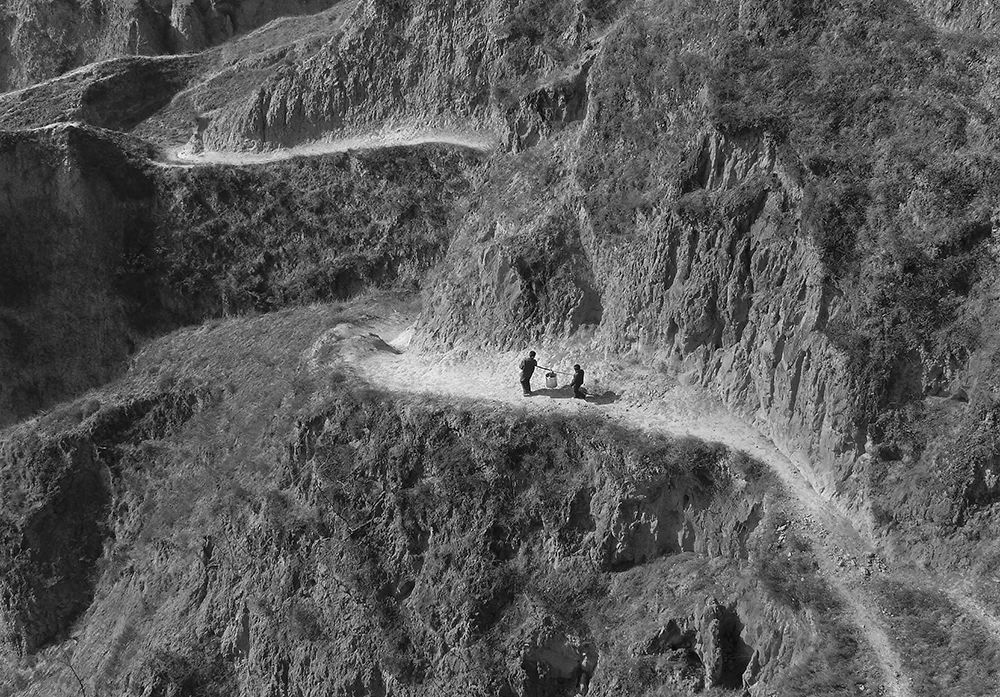 2007年02月22日,甘肃省正宁县榆林子镇小寺头村,两个孩子抬着水桶去沟里的山眼泉去抬水,来回一趟,需要在沟里行走2里的山路。