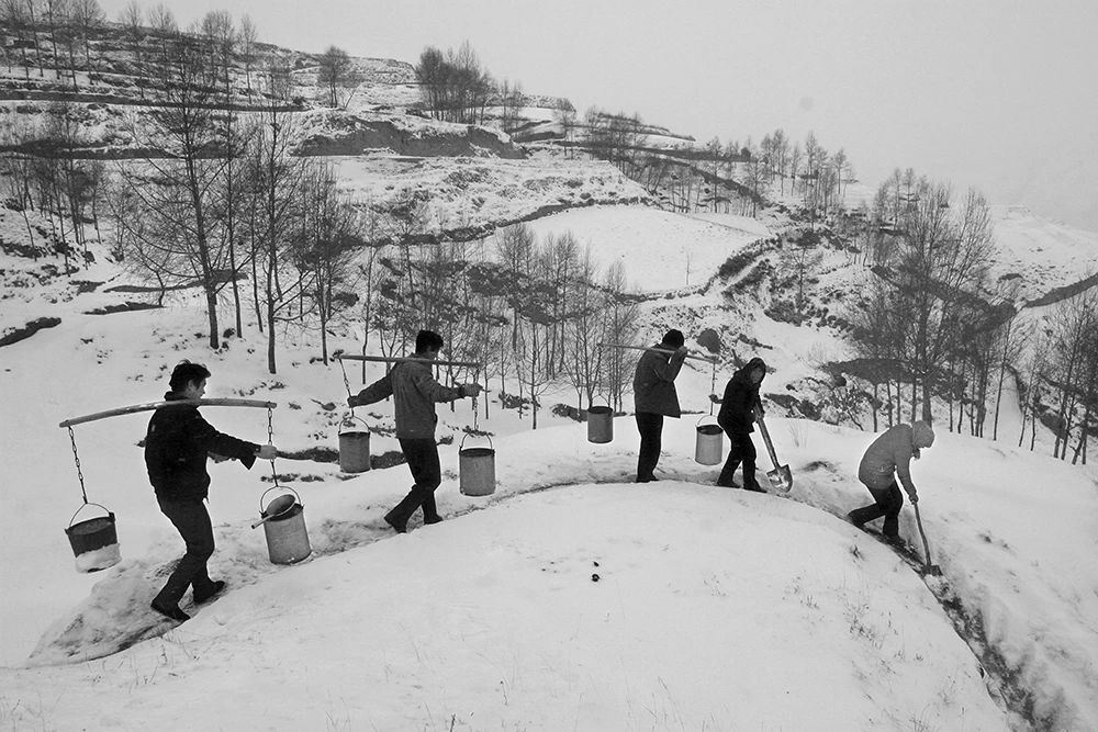 2011年03月20日,甘肃省渭源县大安乡邱家川村,村民从沟里挑水回家,大雪封山,村民用铁锹清理路面积雪,为挑水的村民开通一条希望的通途。