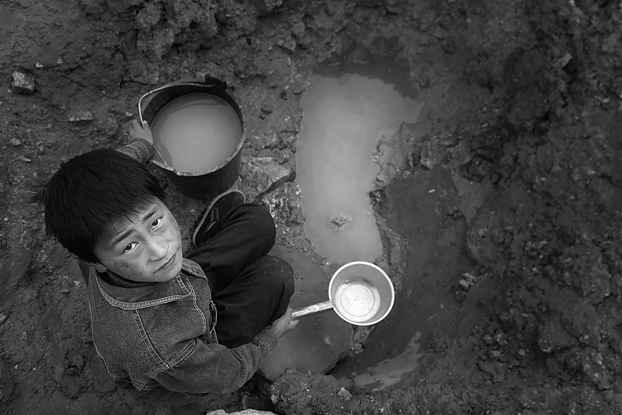 2006年05月06日,甘肃省渭源县大安乡邱家川村,孩子在山下的山眼泉舀水,大安乡属于典型的干旱山区,年降水量只有420毫米左右,严峻的自然环境,给当地群众的正常生活用水带来极大挑战。
