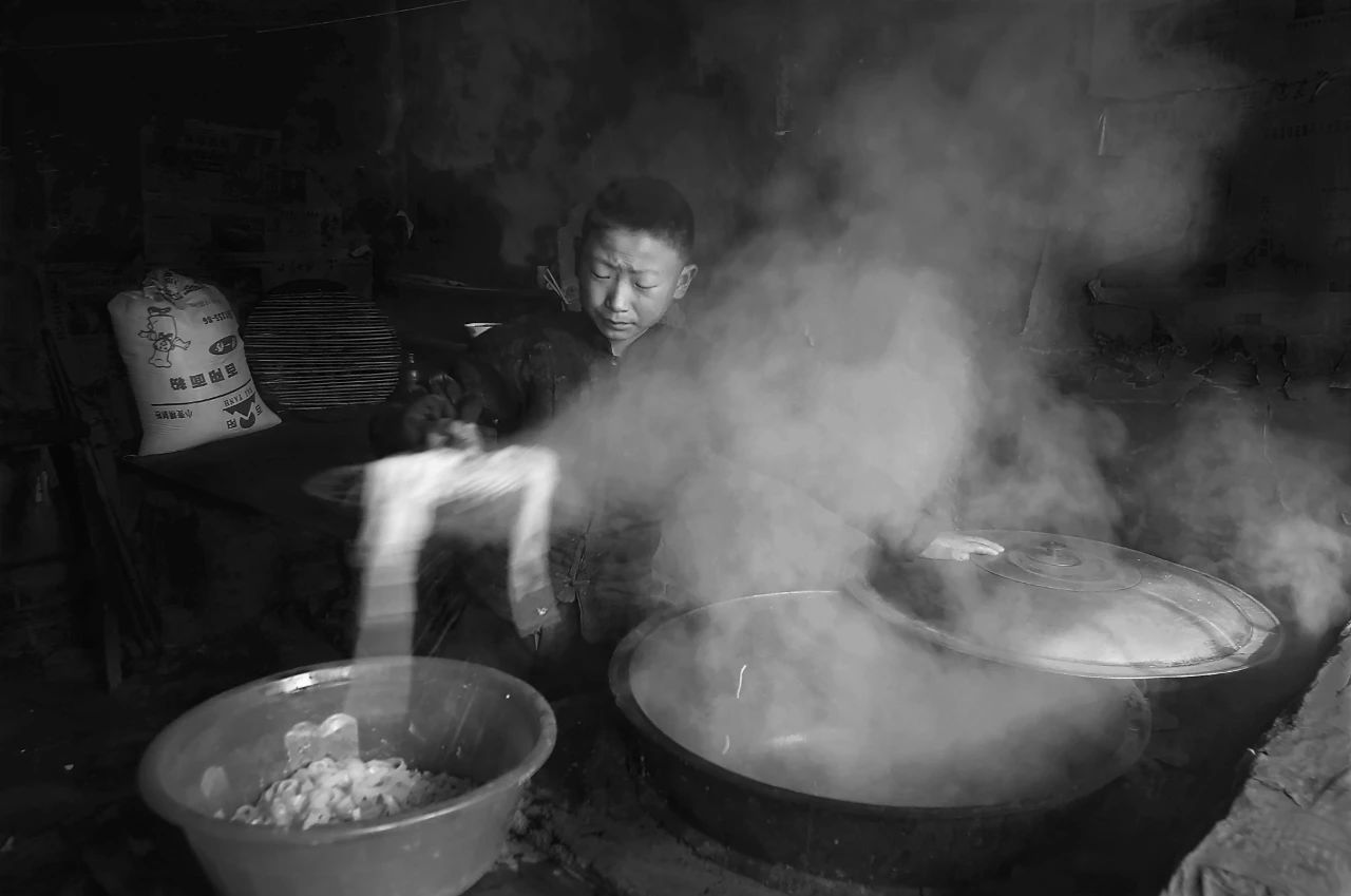 2006年01月27日,甘肃省正宁县榆林子镇小寺头村,孩子用抬回家的水煮粉条。