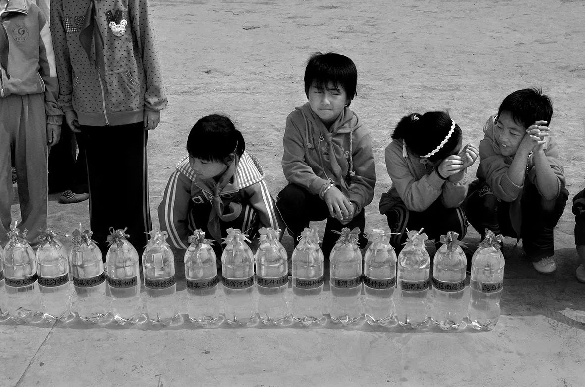 2011年08月30日,甘肃省临洮县玉井乡白家沟村,孩子们拿着装有水的瓶子,参加学校水窖落成仪式。