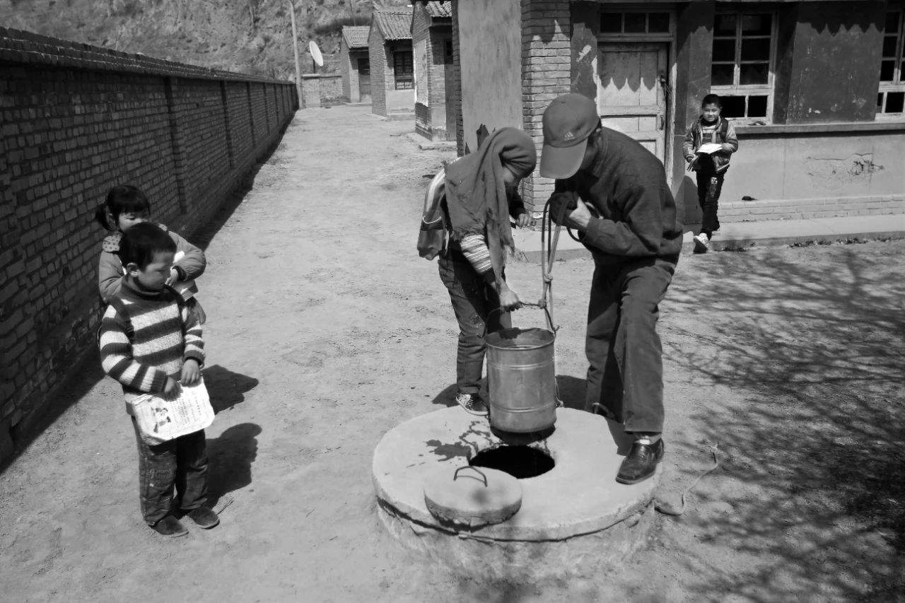 2013年03月15日,甘肃省临洮县龙门镇马家湾村,老师和学生在校园的水窖前打水。
