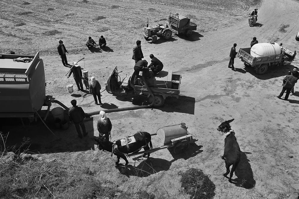 2013年04月11日,甘肃省环县毛井镇施家滩村,村民在村口拉水,由于生活用水告急,政府派送水车送水到村口,供村民拉回家生活饮用。