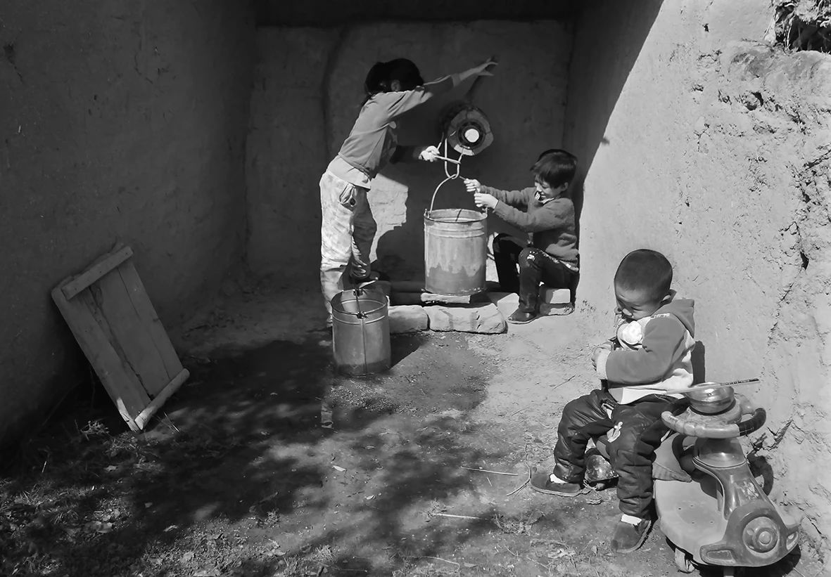 2014年10月02日,甘肃省会宁县太平店镇大山川村,两个孩子用辘轳从井里汲水。