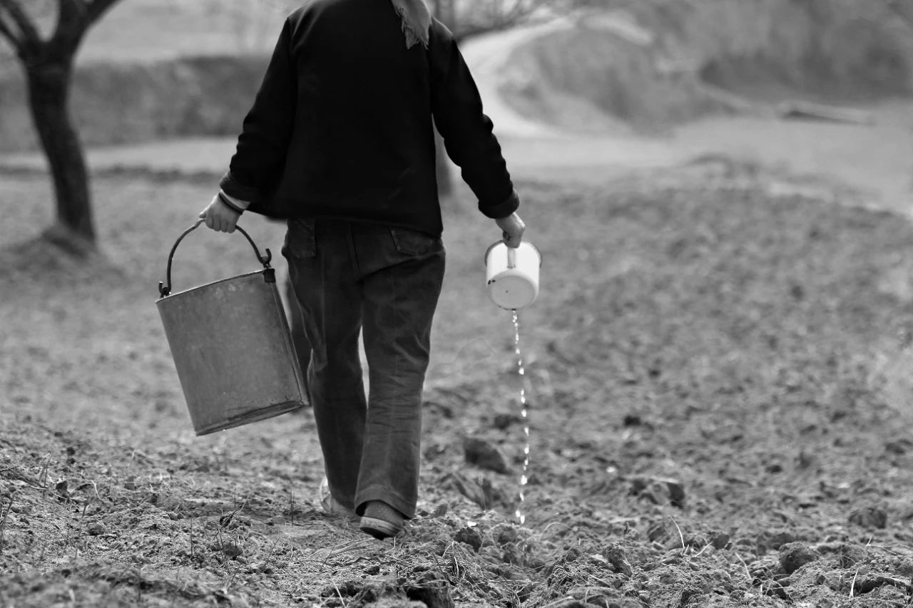 2013年03月15日,甘肃省临洮县龙门镇马家湾村,一位妇女提着水桶给耕种的田地浇水。