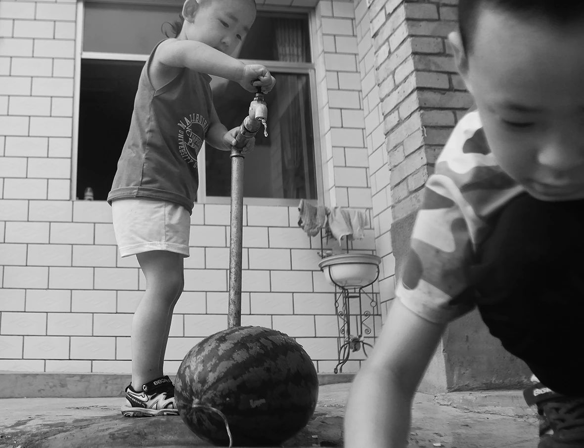 2018年07月23日,甘肃省正宁县榆林子镇小寺头村,孩子在院子打开自来水龙头洗西瓜。
