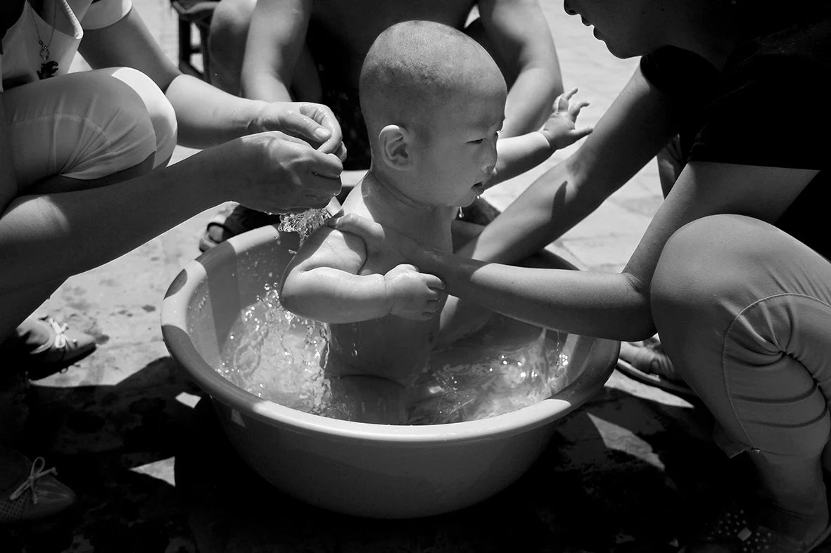 2015年07月18日,甘肃省正宁县榆林子镇小寺头村,村民在自来水龙头旁给孩子洗澡,自来水进入家园解决了农村人往日洗澡难的问题。